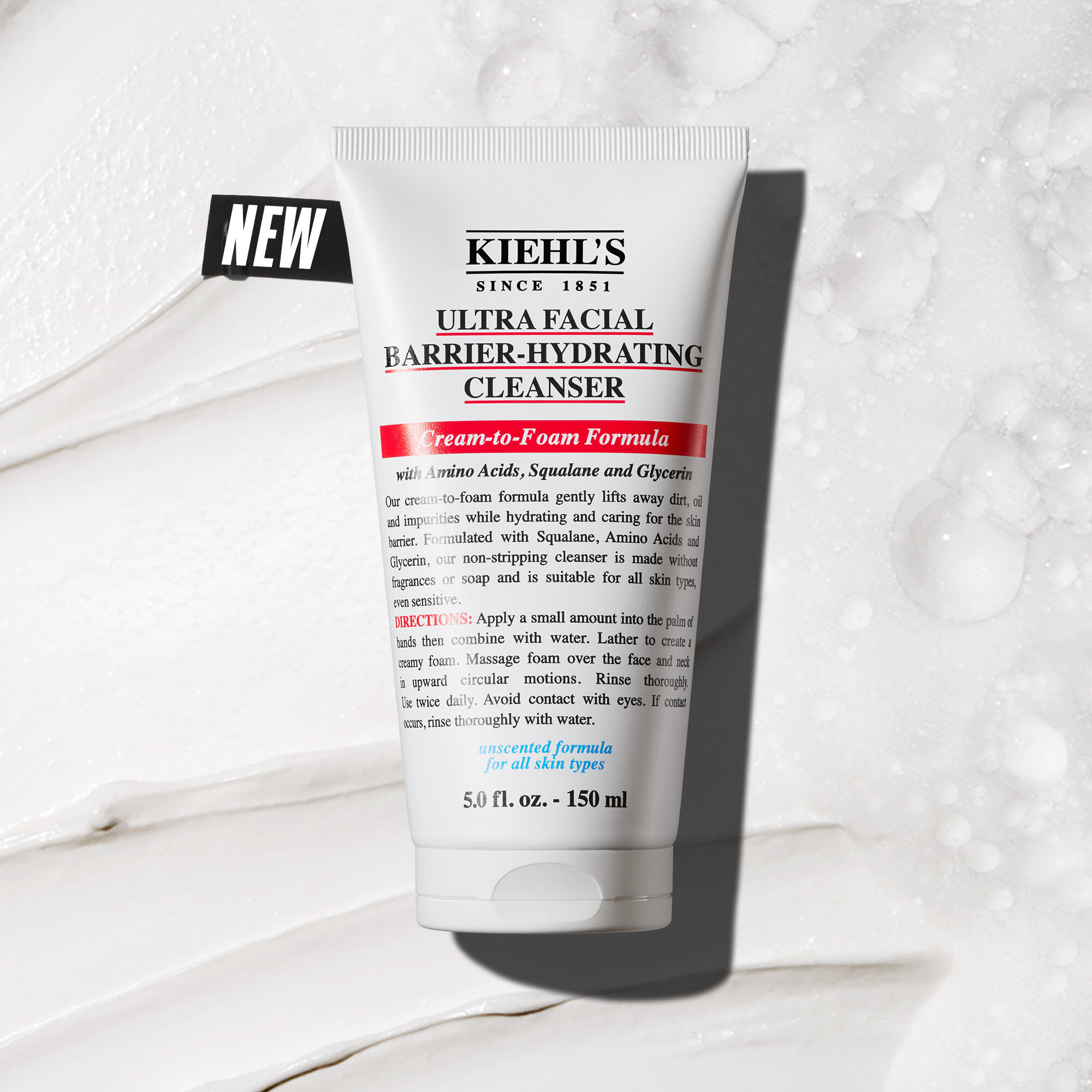 A hydrating cream-to-foam cleanser made for sensitive skin, this gentle, non-stripping formula lifts impurities while supporting the skin’s natural moisture barrier. Kiehl's barrier-hydrating facial cleanser transforms into a dense micro-foam with tiny bubbles that effectively remove dirt, oil, and impurities. Powered by gentle yet effective Amino Acid Surfactants, this amino acid facial cleanser removes dirt, makeup and sunscreen while protecting the skin barrier. Enriched with Squalane and Glycerin, it helps replenish the skin and lock in moisture, leaving your skin soft and supple. Perfect for daily use, this ultra-hydrating formula that helps you stop skin stripping and start cleansing the right way.